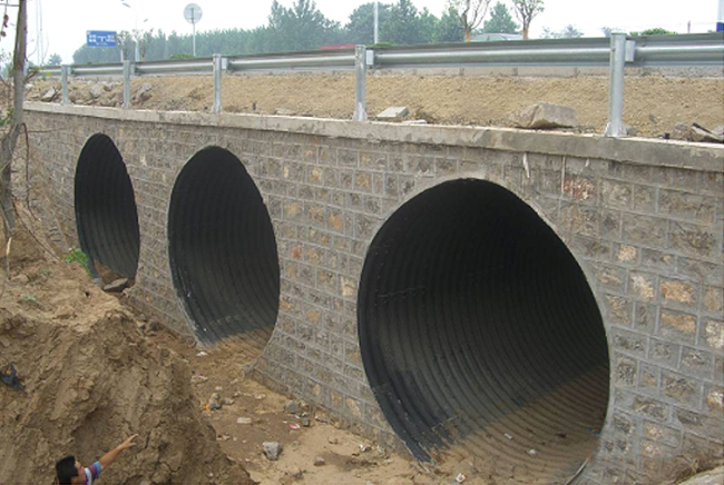 康临高速五标波形钢板桥涵,直径3.3米,涵长140米,三孔并排,替代小桥